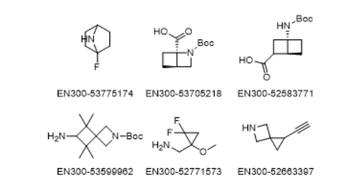 在过去的这一个月中,Enamine 研发的分子砌块数量再创新高,单月合成全新分子砌块达 2576 种,不仅延续了其每月新增 1000-2000 种砌块的稳定研发节奏,更实现规模突破,进一步扩充了全球最大商业分子砌块库(现货超 31 万种)的独家化学空间。这里举几个有趣又实用的例子, 截至笔者写这篇文章时,在 Reaxys 数据库中尚未找到这几类分子砌块应用于新药研发的相关案例,凸显其结构新颖性与专利布局潜力,为全球药企、科研机构突破现有化学空间限制、开发差异化候选药物提供了全新工具。