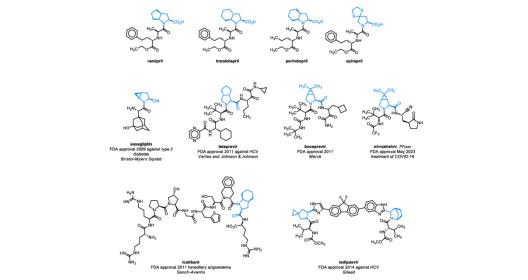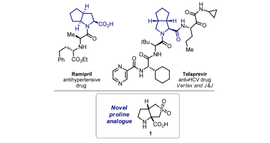 双环脯氨酸是现代药物研发中应用广泛的合成砌块,雷米普利、特拉普韦等药物的结构中均含有该类基团。基于对这类分子的持续研究兴趣,本研究计划合成新型含SO2的双环脯氨酸1(图1)。本文将报道该化合物的合成方法,并阐述关键的[3+2]环加成步骤如何逐步发展为合成药物化学用稠合与螺环砜类化合物的通用方法。